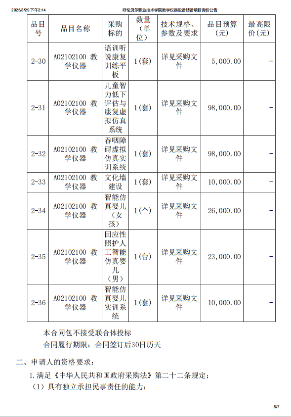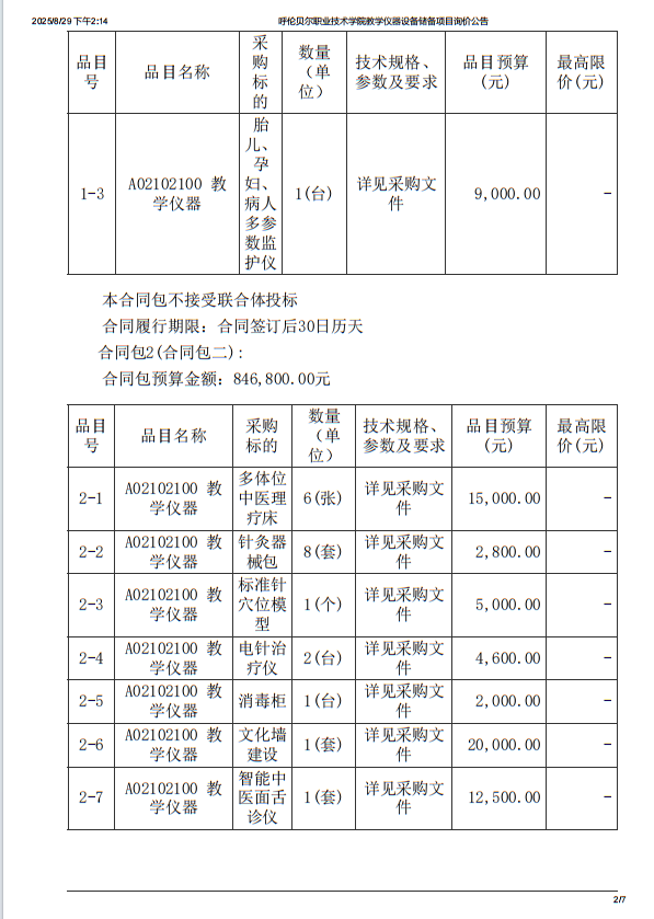呼伦贝尔职业技术学院教学仪器设备储备项目询价公告