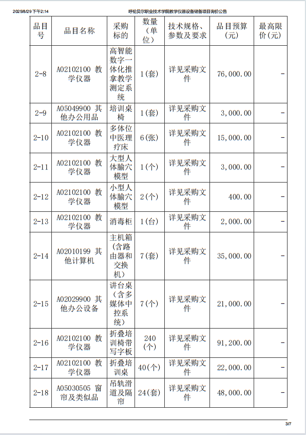 呼伦贝尔职业技术学院设备采购项目询价公告
