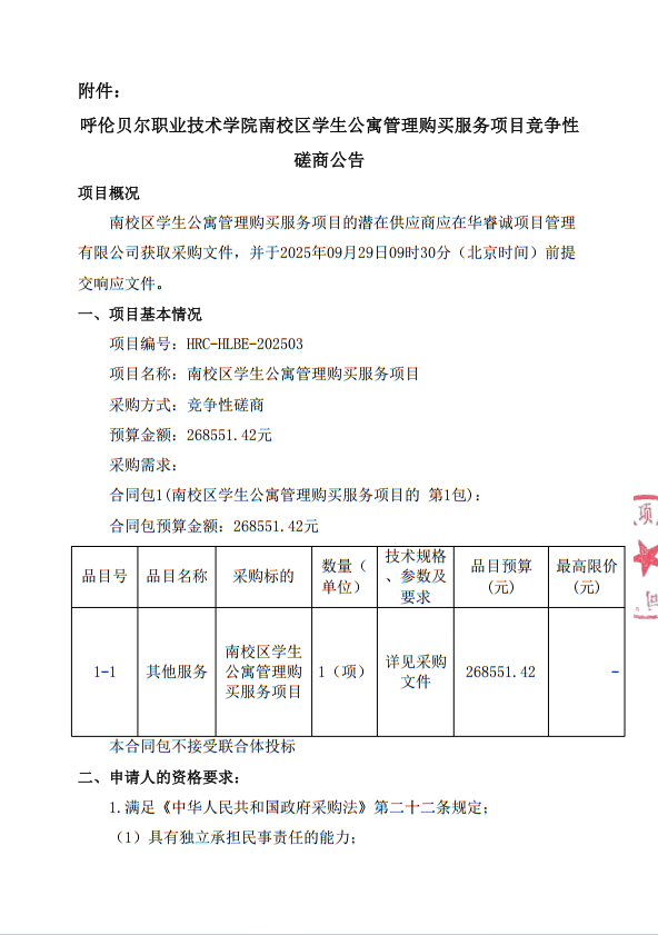 呼伦贝尔职业技术学院南校区学生公寓管理购买服务项目竞争性磋商公告