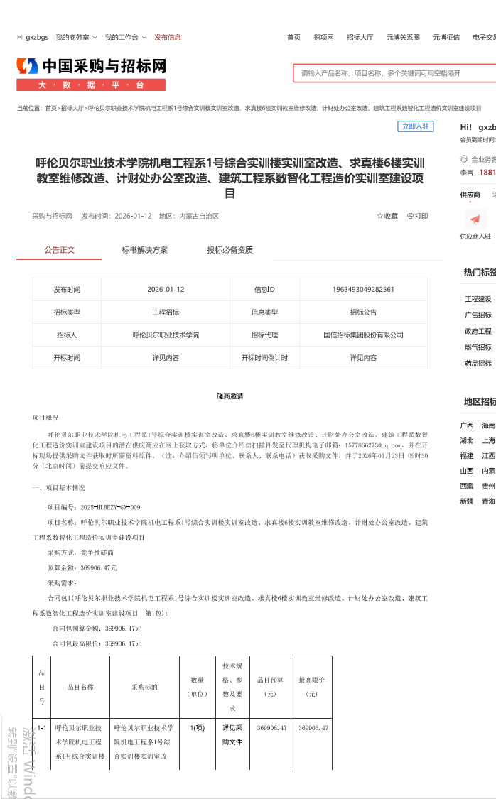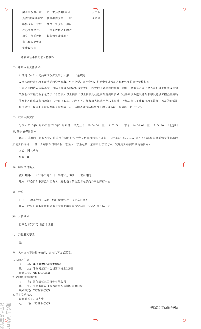 呼伦贝尔职业技术学院机电工程系1号综合实训楼实训室改造、求真楼6楼实训教室维修改造、计财处办公室改造、建筑工程系数智化工程造价实训室建设项目